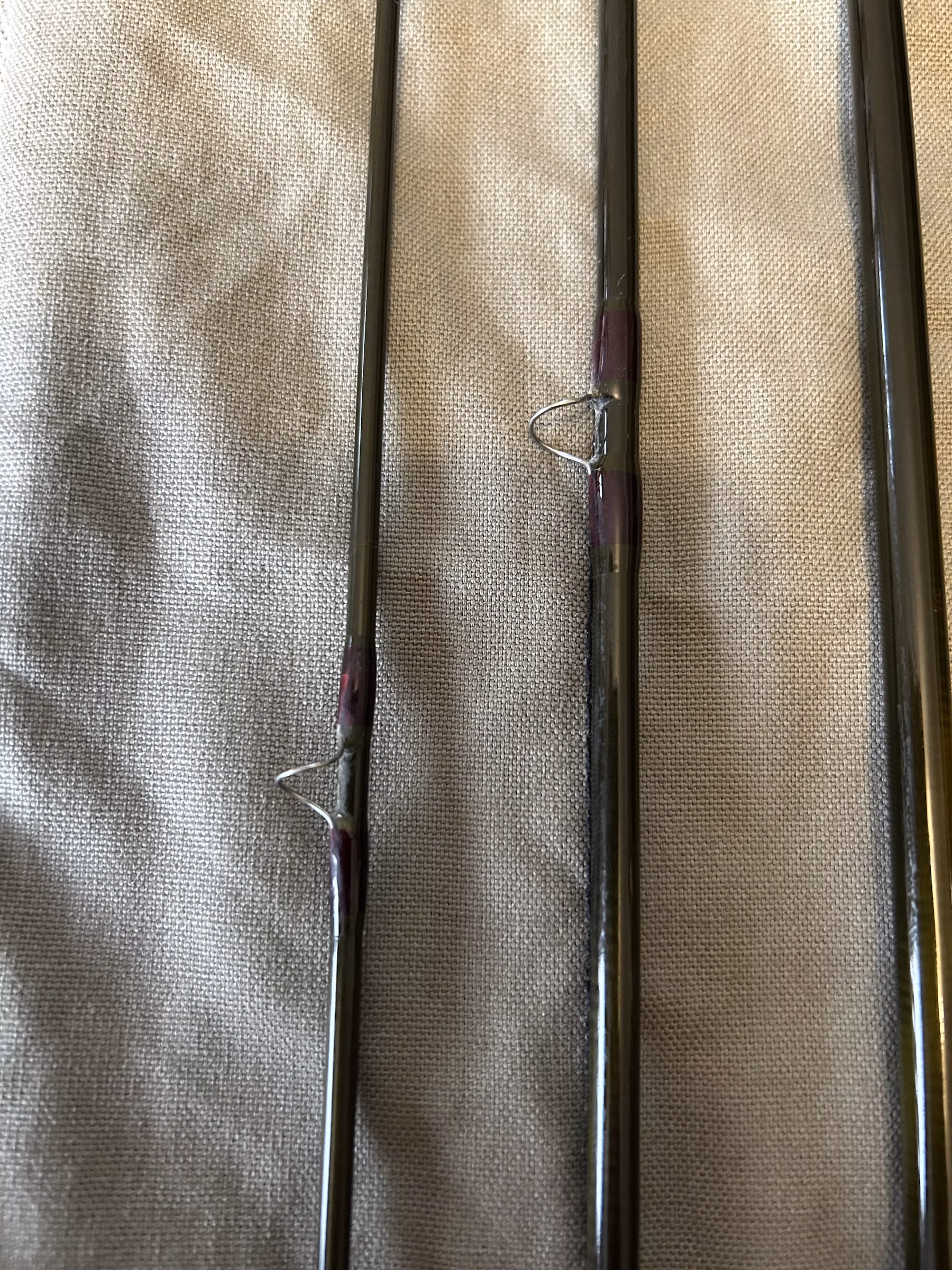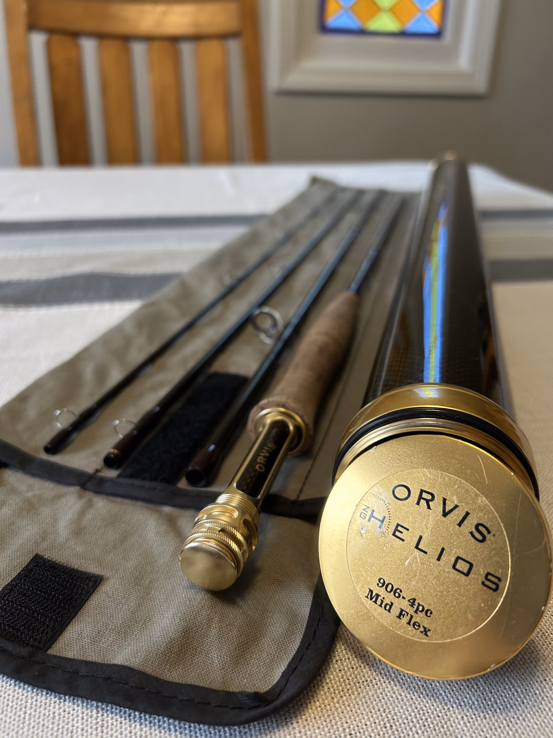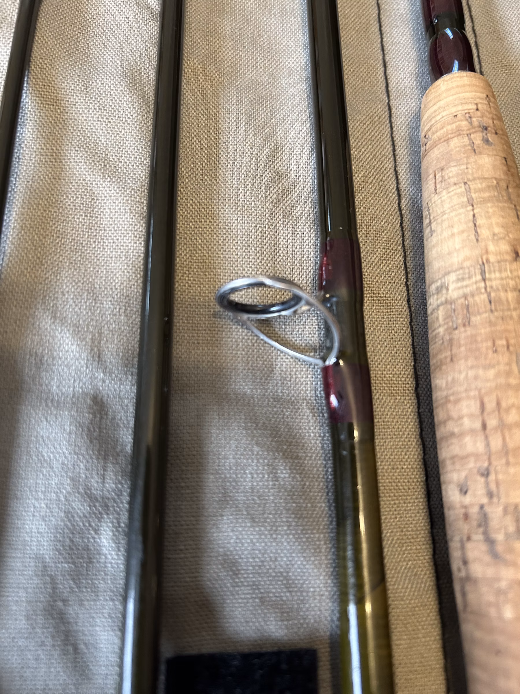Fisher one season and well cared for. Rod is in excellent condition, and the carry tube is in good condition (see pics for a few dings). Don’t let the Mid-Flex fool you – this is a med-fast action rod that performs better with a higher line wt (I fish a 7wt line on this guy). Beautifully crafted and stunning colors (dark olive & ox blood on the blanks – and crisp gold hardware).