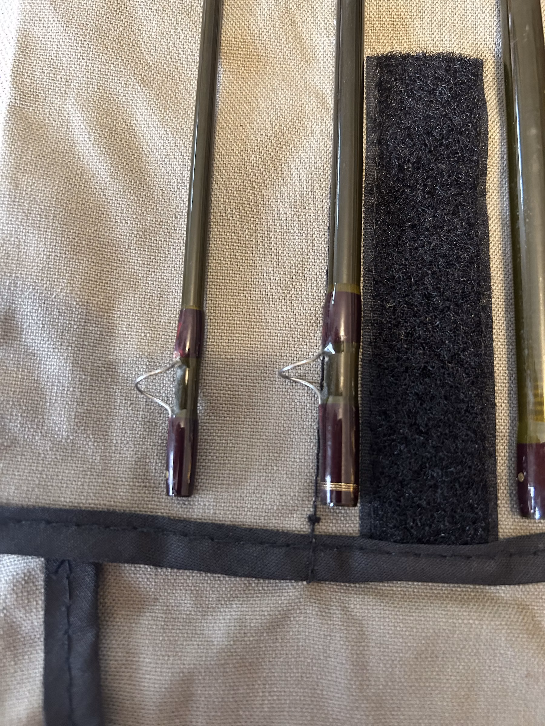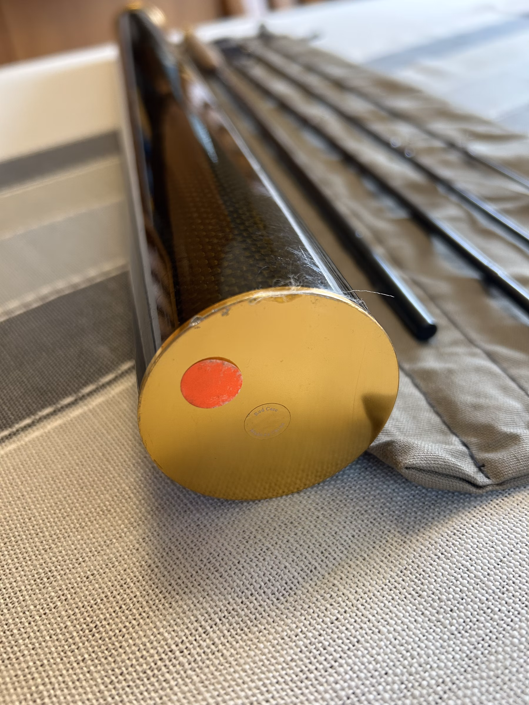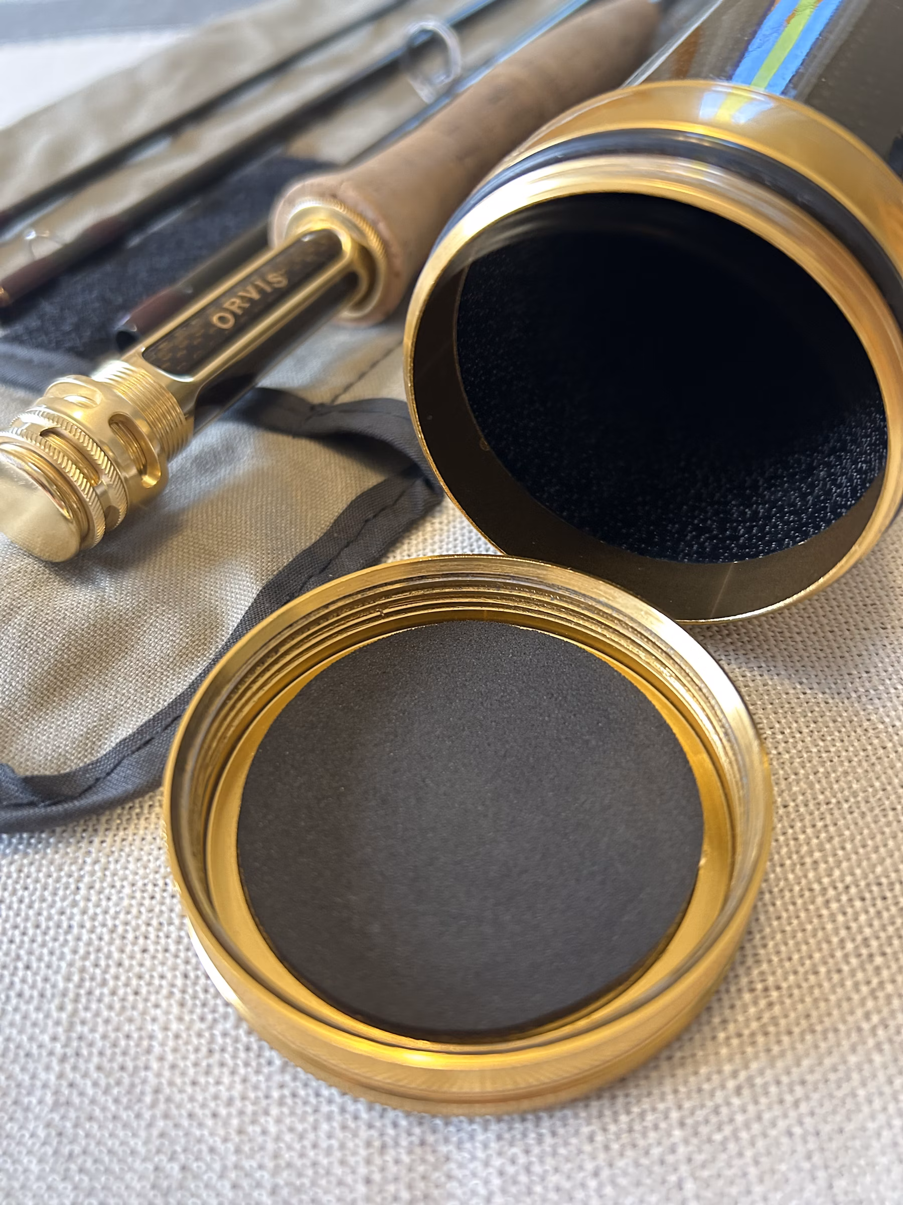 Fisher one season and well cared for. Rod is in excellent condition, and the carry tube is in good condition (see pics for a few dings). Don’t let the Mid-Flex fool you – this is a med-fast action rod that performs better with a higher line wt (I fish a 7wt line on this guy). Beautifully crafted and stunning colors (dark olive & ox blood on the blanks – and crisp gold hardware).